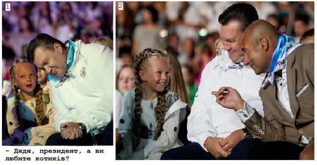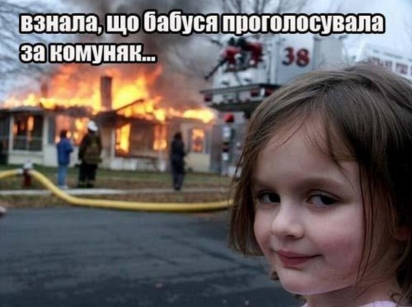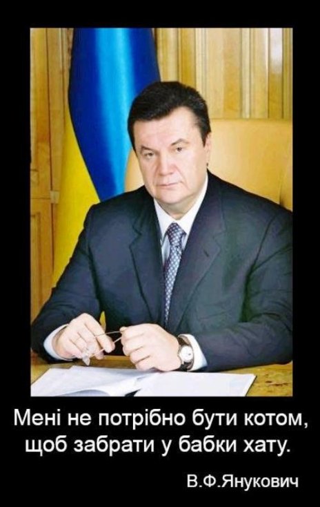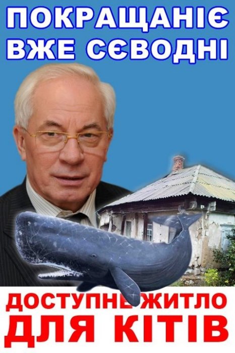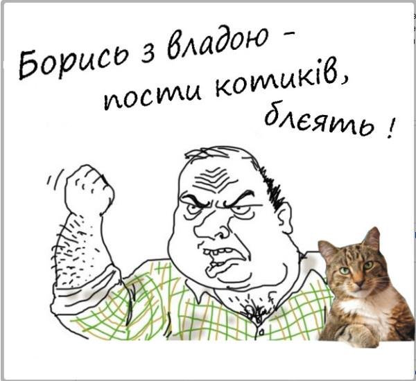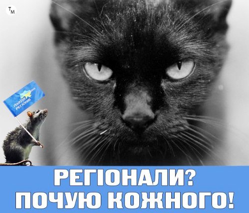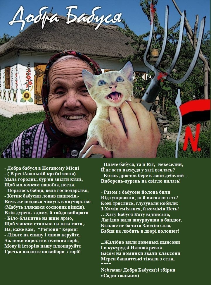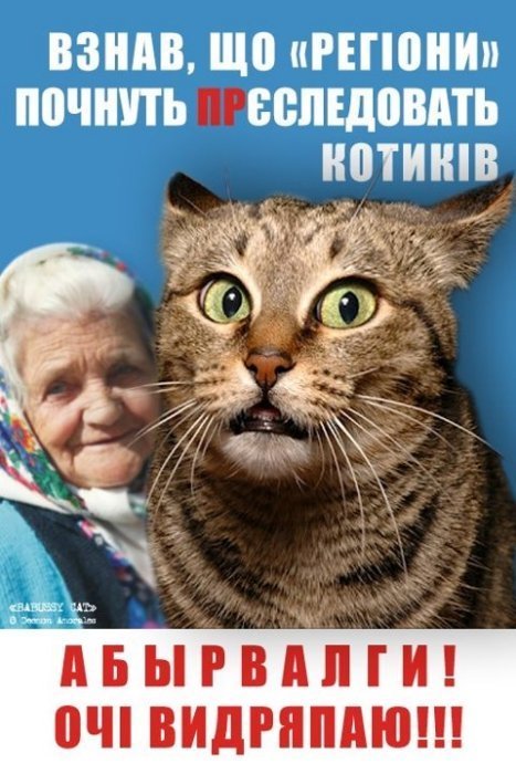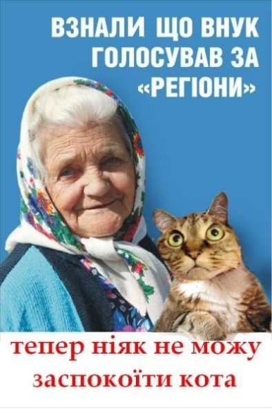 Зокрема, на одному з них зображена бабуся з котом і підпис: «Взнала, що онук голосував за «регіони», переписала хату на кота».