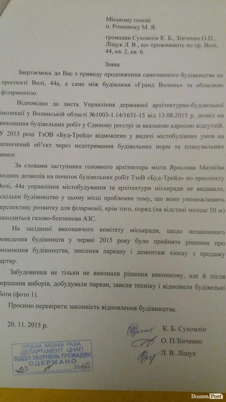 За словами заступника головного архітектора міста Ярослава Матвіїва, два роки тому, ТзОВ «Буд-Трейд», очолюване Юлією Кухарчук, яка між іншим у 2012 році балотувалася в народні депутати від Політичної партії «УДАР», отримало дозвіл від управління містобудування та архітектури Луцька зводити будинок лише на 6 поверхів замість 10-ти запланованих.