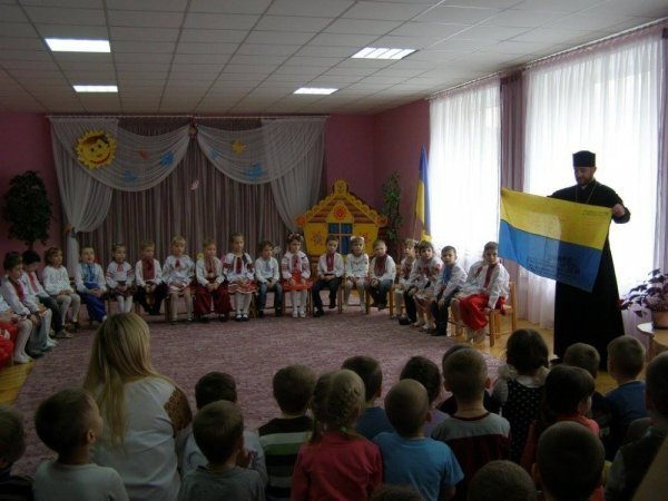 Настоятель парафії Преподобного Іова Почаївського в Луцьку (район ДПЗ) священик Олександр Вронський передав дітям та колективу дошкільного навчального закладу № 22 прапор України із підписами бійців полку «Київ».