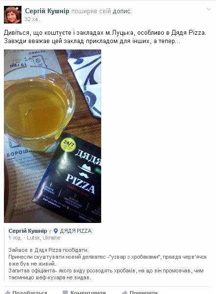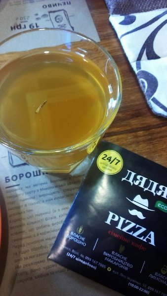 "Зайшов в "Дядя Pizza" пообідати. Принесли скуштувати новий делікатес -"узвар з хробаками", правда, черв'ячок вже був неживий.