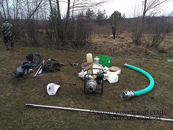 Поліцейські прибули у лісовий масив та виявили 6 чоловік, які за допомогою мотопомпи здійснювали незаконний видобуток бурштину-сирцю, шляхом його вимивання.