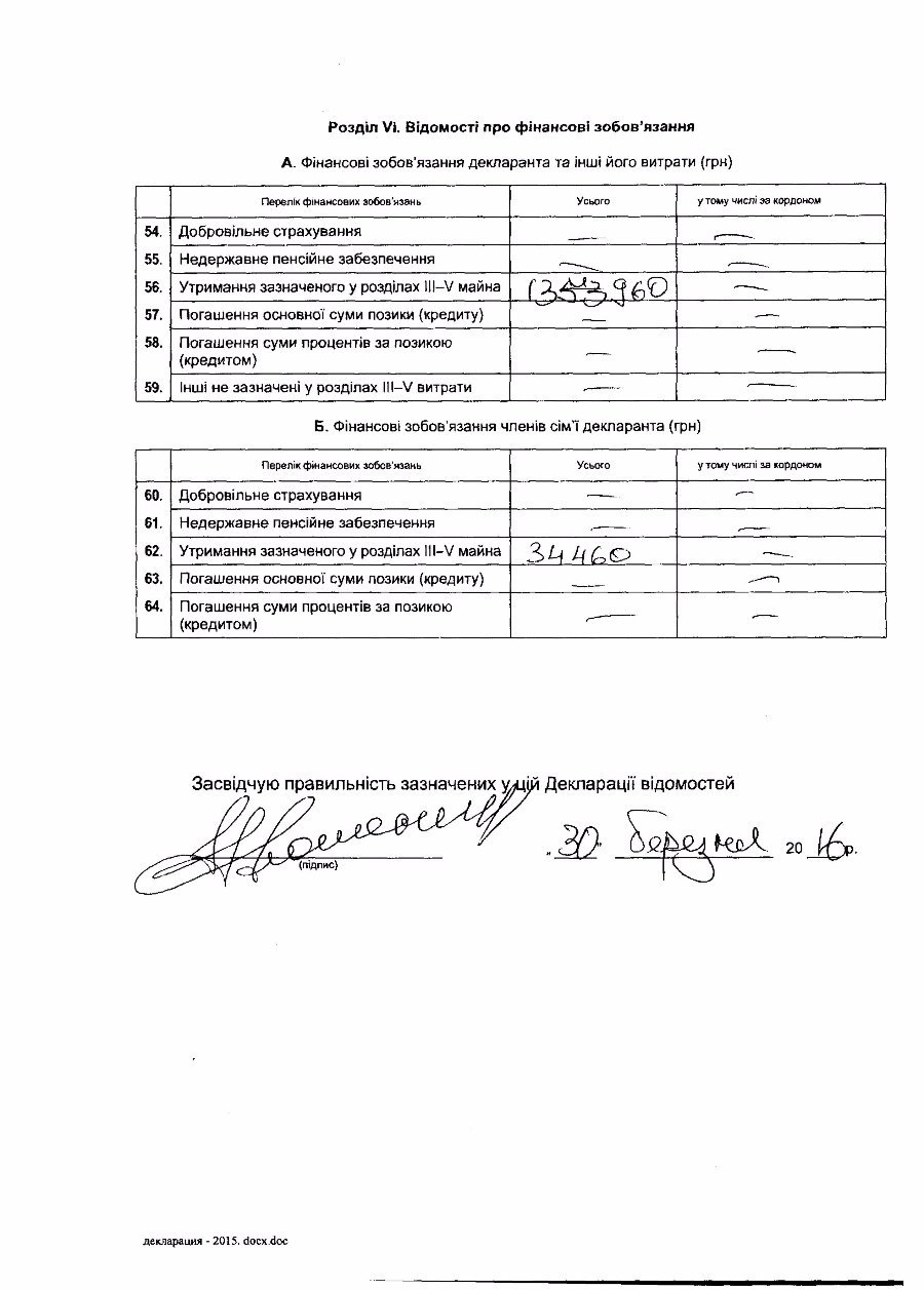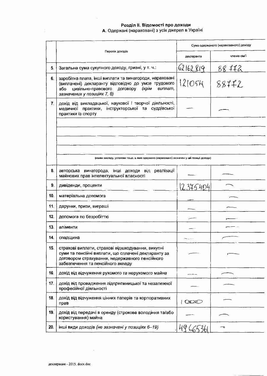 Загальна сума доходів президента в минулому році склала 62 162 819 грн, з якою зарплата - 121 054 грн. Члени родини президента отримали 88 772 грн, які заначаються як заробітна плата.