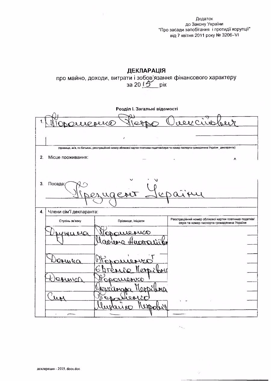 У декларації про доходи за 2014 рік президент вказував суму загального доходу у 368 млн грн, члени родини отримали 36 тис. грн доходів. Таким чином, у минулому році доходи глави держави зменшилися майже вшестеро.