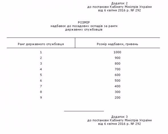 Згідно з документом, держслужбовець 1-го рангу отримуватиме надбавку до посадового окладу в розмірі 1 тис. гривень. Далі з кожним зниженням рангу сума надбавки зменшуватиметься на 100 грн.