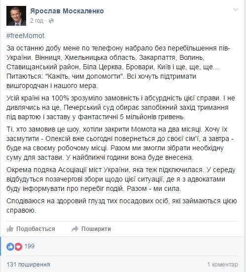 Ті, хто замовив це шоу, хотіли закрити Момота на два місяці. Хочу їх засмутити - Олексій вже сьогодні повернеться до своєї сім'ї, а завтра - буде на своєму робочому місці. Разом ми змогли зібрати необхідну суму для застави. У найближчі години вона буде внесена.