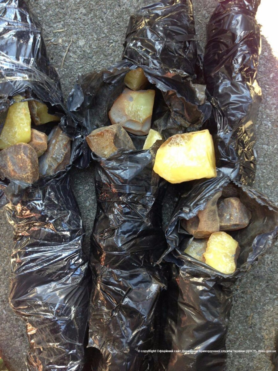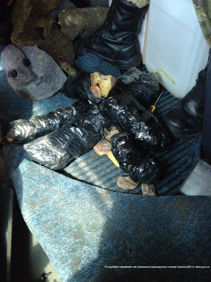 В ході огляду кабіни вантажівки оглядовою групою під панеллю приладів та під декоративною обшивкою спального відділення було виявлено перемотані скотчем пакунки з необробленим камінням бурштину вагою 5 кілограмів 840 грамів. Пояснити, звідки взялось каміння в його автомобілі, водій-далекобійник не зміг, або робив все для того, щоб охоронці кордону в це повірили.