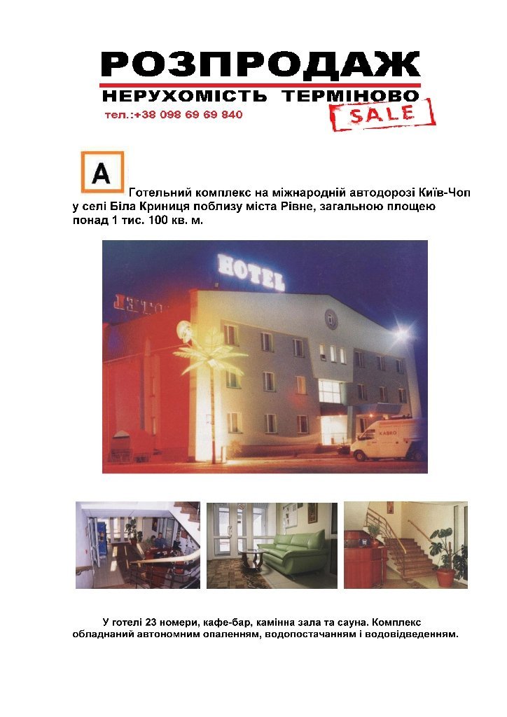 Нині таку нерухомість можна доволі вигідно придбати. Зокрема, на Рівненщині з вигодою можна купити готельний комплекс загальною площею понад 1 тис. 100 кв. м. Він знаходиться на міжнародній автодорозі Київ-Чоп у селі Біла Криниця поблизу Рівного. В готелі 23 номери, кафе-бар, камінна зала та сауна. Комплекс обладнаний автономним опаленням, водопостачанням і водовідведенням.