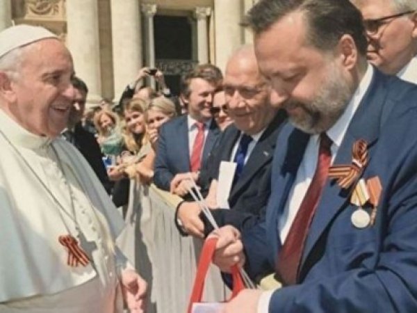 Нагадаємо, Папа Римський одягнув георгіївську стрічку на прохання депутата Держдуми.