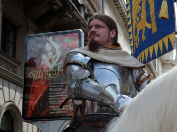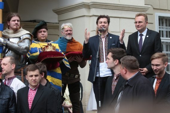На площі Ринок ходу зустріли мер міста Андрій Садовий з дружиною Катериною. Імпровізовані Король Лев та Королева Констанція передали їм ключ від міста.