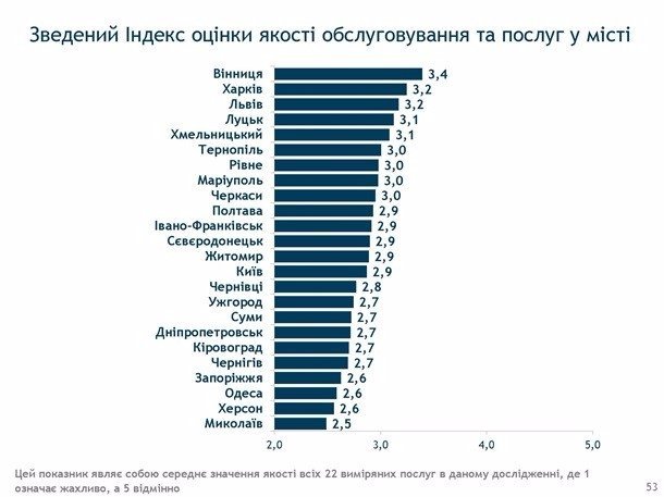 Українці давали містам оцінку за 22 категоріями. Останнім в списку найкомфортніших міст став Миколаїв. Відзначимо, що Київ зайняв в рейтингу 14 місце.