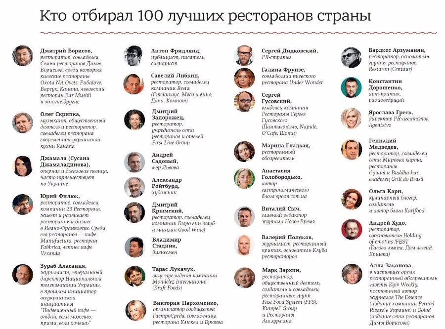Головним критерієм при складанні списку стала їжа. Нас значно більше цікавить вміст тарілок, ніж дорожнеча інтер'єру. Ми також хотіли, щоб наш список охопив якомога більшу територію України і був прикладним посібником для тих, хто подорожує країною. У журі ми запросили 30 осіб, більшість з яких - відомі ресторатори з усієї країни, ресторанні критики і бізнесмени, які люблять поїсти і знаються на їжі. Їх імена ви можете побачити на сусідній сторінці".