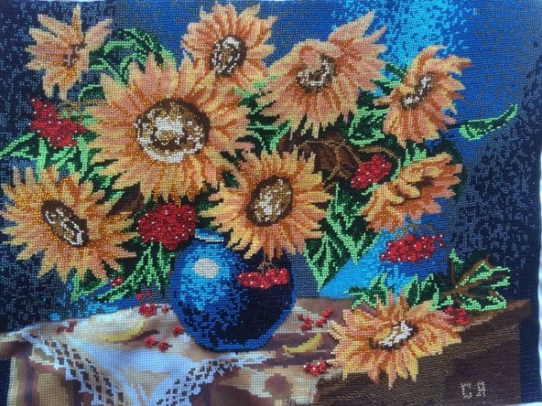 Спочатку вишивав тільки ікони, опісля почав вишивати на замовлення і сорочки та блузи, рушнички, навіть картини. Ось зараз вишиває картину «Соняшники», яку замовила йому українка з Італії. Для неї це – спогад про рідний край. А для Андрія – дуже болючі спогади про півроку у зоні неоголошеної війни, символом якої стали і мирні соняшники...