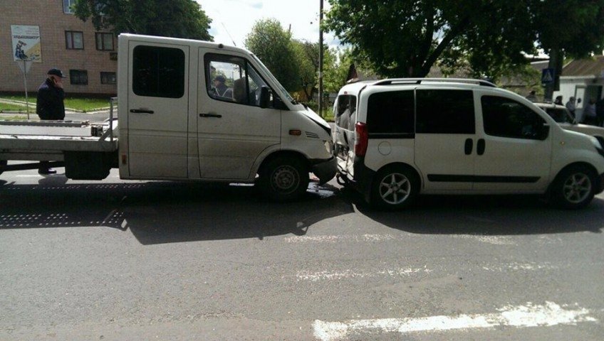 Водій автомобіля “Фольксваген” пропускав літню жінку на пішохідному переході. Позаду рухався автомобіль “Мерседес Спрінтер”, водій якого не врахував безпечної дистанції та зіткнувся з автомобілем, який саме стояв перед переходом.