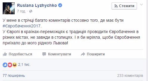 "У Європі в країнах-переможцях є традиція проводити "Євробачення" в різних містах, не завжди в столицях. І я би мріяла, щоби "Євробачення" приїхало до мого рідного Львова!", - написала співачка у Фейсбуці.