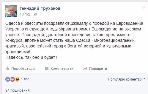 «Одеса і одесити вітають Джамалу з перемогою на Євробаченні! Упевнений, що в наступному році Україна проведе Євробачення на високому рівні. Майданчиком, гідним проведення такого престижного конкурсу, цілком може стати наша Одеса – багатонаціональне, красиве, європейське місто з багатою історією та культурними традиціями!», – написав Труханов.