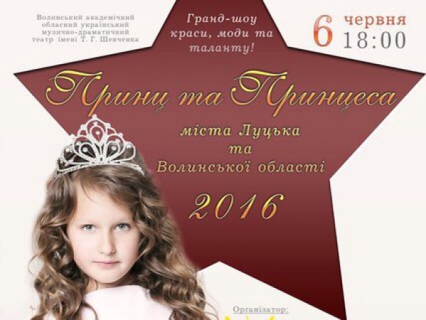 6 червня о 18:00 у Волинському драматичному театрі їм. Т.Г.Шевченка відбудеться благодійне гранд-шоу краси, моди та таланту "Принц та Принцеса міста Луцька та Волинської області-2016".