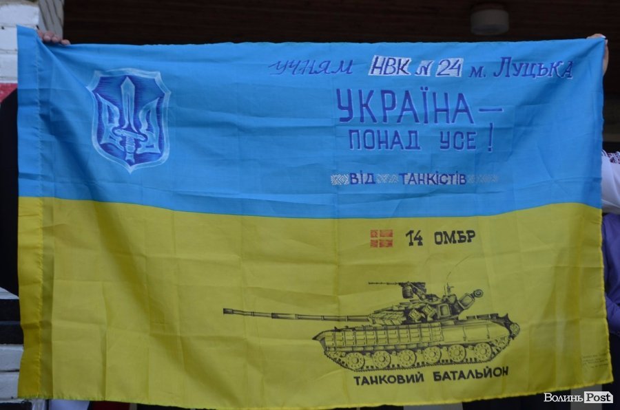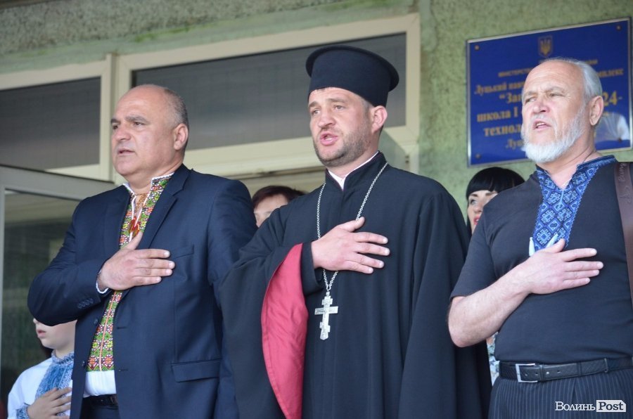 Пізніше слово взяв капелан батальйону спецпризначення «Січ» та настоятель парафії Преподобного Іова Почаївського в Луцьку Олександр Вронський. Священик не лише подякував дітям за підтримку бійців 14-ї окремої механізованої бригади, а й привіз вихованцям НВК №24 прапор від бійців, який вони розмалювали спеціально для учнів школи.