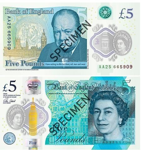 На купюрі в 5 фунтів стерлінгів зображена королева Британії Єлизавета II, а на зворотному боці - колишній прем'єр-міністр Уїнстон Черчилль.