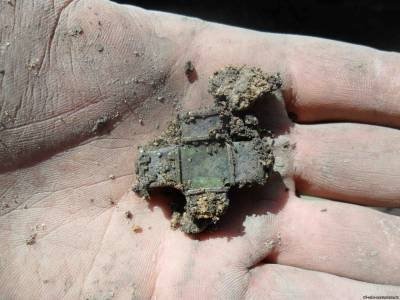 Поруч зі скарбом учасники експедиції виявили фрагмент верхньої частини гончарного горщика ХІІ - першої половини ХІІІ століття зі слідами окислення кольорового металу.