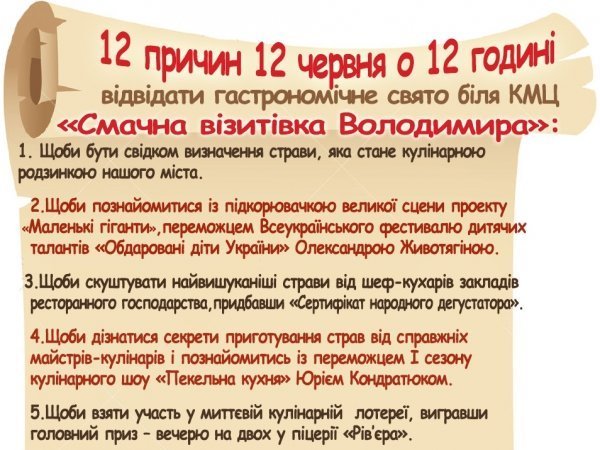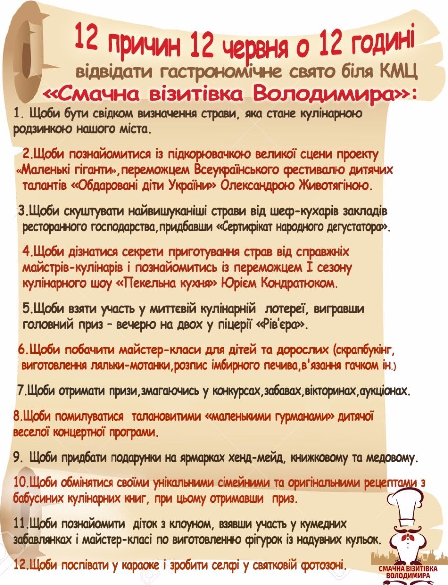 Виконавчий комітет Володимир-Волинської міської ради спільно з Центром позашкільної освіти 12 червня 2016 року організовує кулінарне свято "Смачна візитівка Володимира".