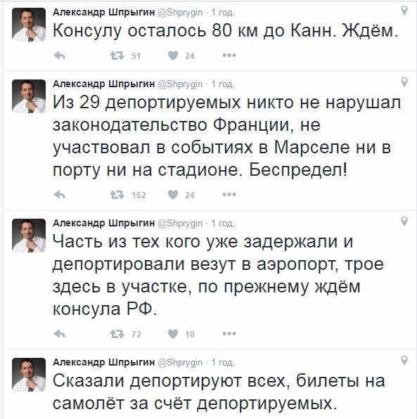 Шпригін стверджує, що першому ж вболівальнику, якого вивели з автобуса, оголосили про депортацію із Франції.