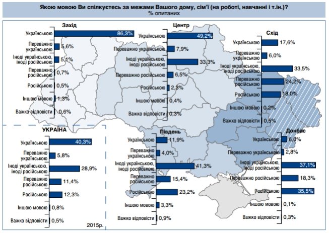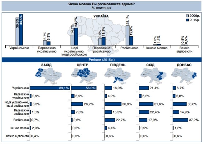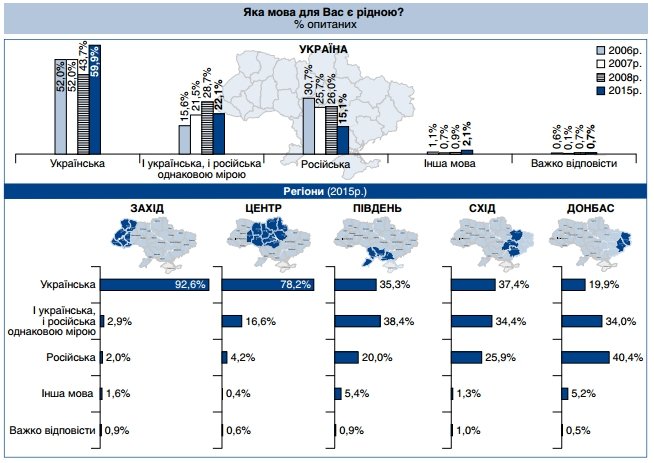На Заході і в Центрі для більшості респондентів рідною мовою є українська (відповідно, 93% і 78%). На Півдні і Сході близькі частки респондентів називають рідними українську та дві мови рівною мірою (відповідно, 35% і 38%, та 37% і 34%). На Донбасі відносна більшість (40%) респондентів вважають рідною російську мову, дві мови – 34%, українську – 20%.