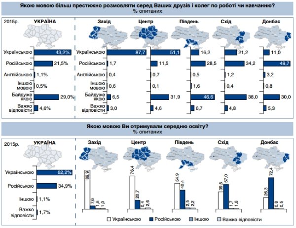 За даними дослідження, українська мова є престижною для преважної більшості жителів Заходу та більшості жителів Центру, тоді як на Донбасі для більшості престижною є російська мова, а на Півдні і Сході України для відносної більшості це питання не є актуальним.