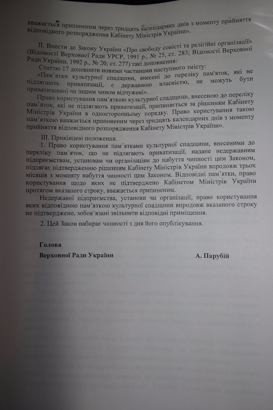 Нижче наведені Постанова ВР «Про комплекси Києво-Печерської та Свято- Успенської Почаївської Лавр», Закон України «Про внесення змін та доповнень до Закону України «Про охорону культурної спадщини» та Закону України «Про свободу совісті та релігійні організації» щодо охорони пам᾿яток культурної спадщини, що не підлягають приватизації», та пояснювальна записка до проекту вищевказаного закону.