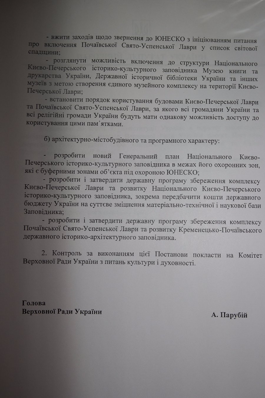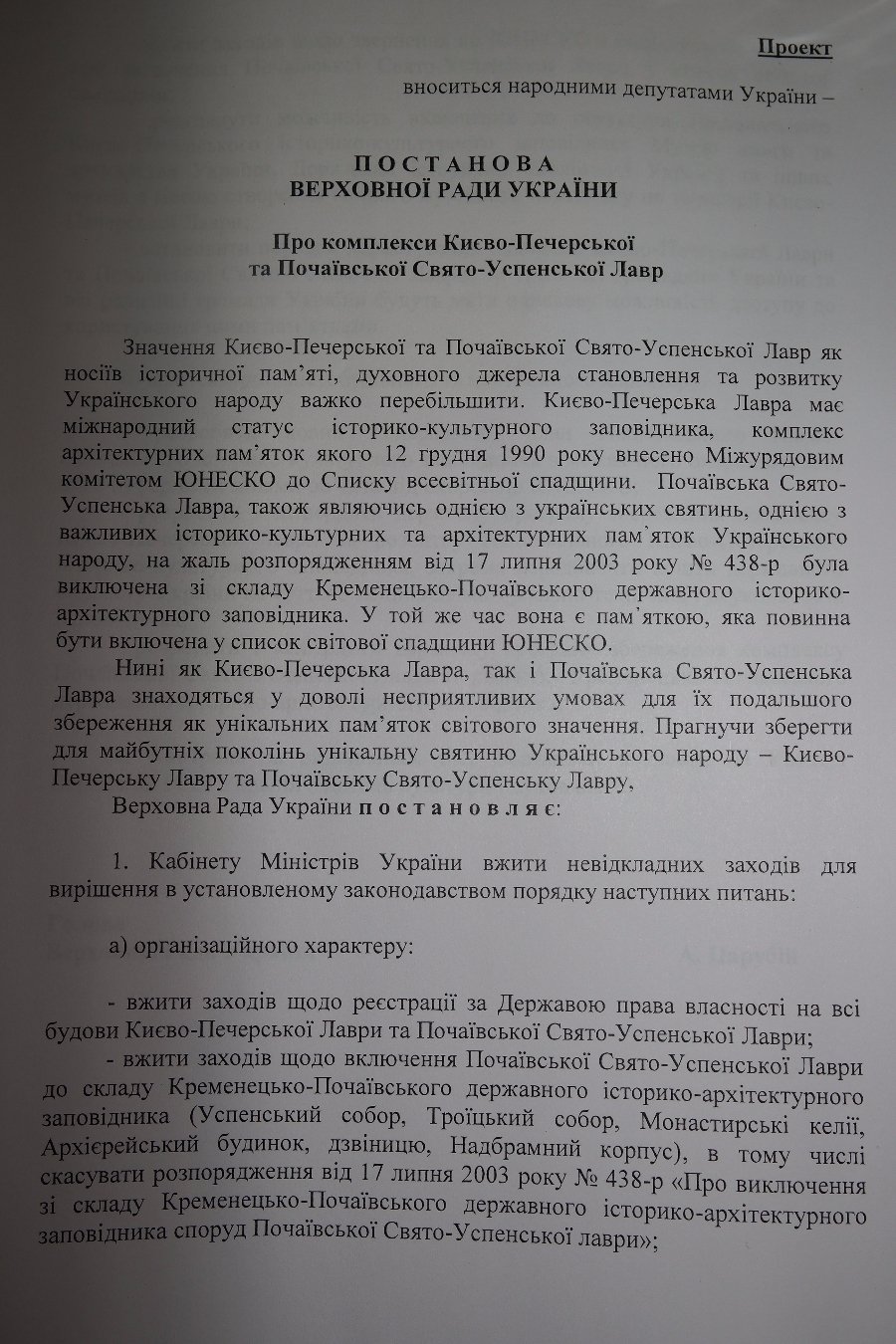 У проекті Постанови Верховної Ради «Про комплекси Києво-Печерської та Свято-Успенської Почаївської Лавр» цим об'єктам повертають статус історико-культурних заповідників та вносять до реєстру пам'яток ЮНЕСКО.