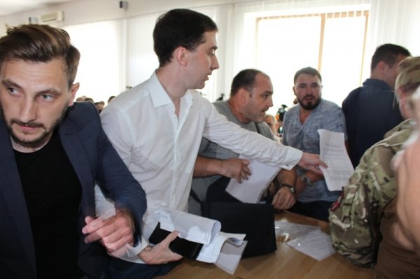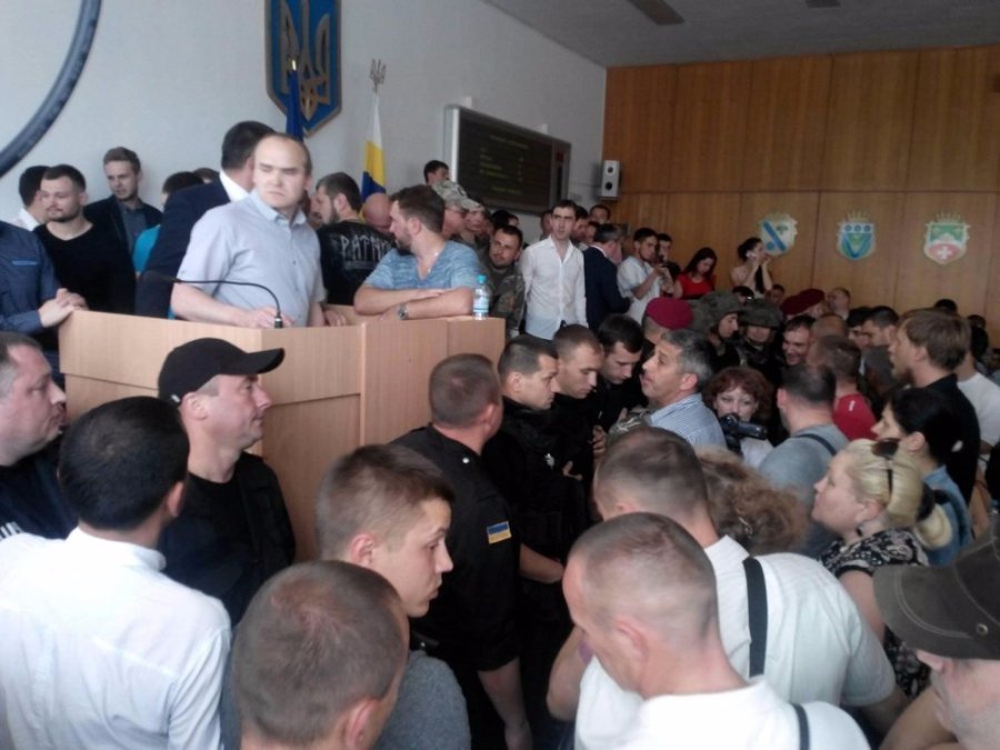 Люди вилазять на столи, кричать у мегафон, а голові облради Олександру Корнійчуку підбили око, кинувши в нього пляшку з мінералкою.