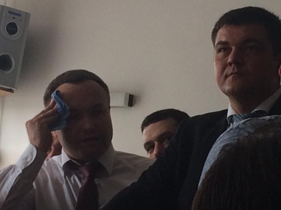 "Корнійчук відкрив сесію, йому чимось бризнули в обличчя, судячи з того, що з оком, - це не вода. То жахливо, як в тому дурдомі звучить гімн. Тепер два голови говорять одночасно", - про це повідомляє журналістка з місця події Інна Білецька на своїй сторінці у Facebook.