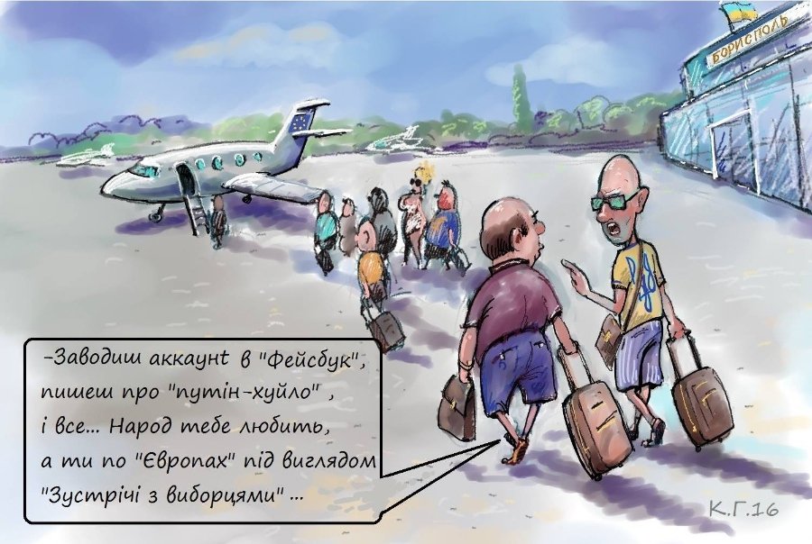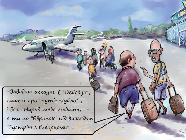 «Заводиш аккаунт в Facebook, пишеш про «Путін - ху * ло», і все Народ тебе любить, а ти по «Європах» під виглядом «Зустрічі з виборцями», - звертається намальований лідер «Народного фронту» до свого співрозмовника.
