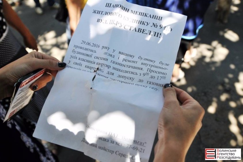 Одна із жінок розповідає, що на усіх під’їздах розклеїли оголошення про проведення огляду та ремонту внутрішньо-будинкової системи газопостачання. До слова, в оголошенні про встановлення лічильника ‒ ні слова. За словами мешканців будинку, вони телефонували за номером, вказаним в оголошенні, але там ніхто слухавку так і не взяв.