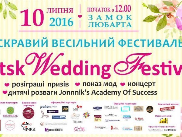 10 липня у Луцькому замку на вас чекає грандіозна подія – «Lutsk.Wedding.Fest 2016. Вперше у нашому місті весільний фестиваль грандіозного масштабу: презентації, майстер-класи, дитячі розваги, виступи різноманітних гуртів та колективів і, звичайно, розіграш цінних сертифікатів від партнерів та багато-багато іншого.