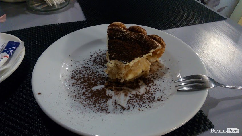Отже, принесли мені "Тірамісу" і мокачино, яке мало б бути з шоколадом. Натомість була налита карамель. Але я не дуже звернула на це увагу, тому що нарешті знайшла його - "Тірамісу". Це дійсно смачно, це дійсно маскарпоне, а не збиті вершки або ще щось, це дійсно савоярді, змочене у каві. Ура! Я задоволена.