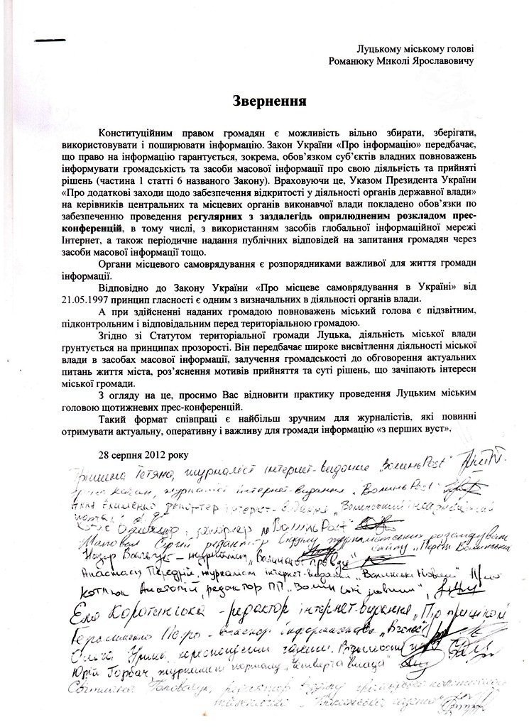 Представники засобів масової інформації Луцька направили до луцького міського голови Миколи Романюка звернення з проханням відновити щотижневі прес-конференції.