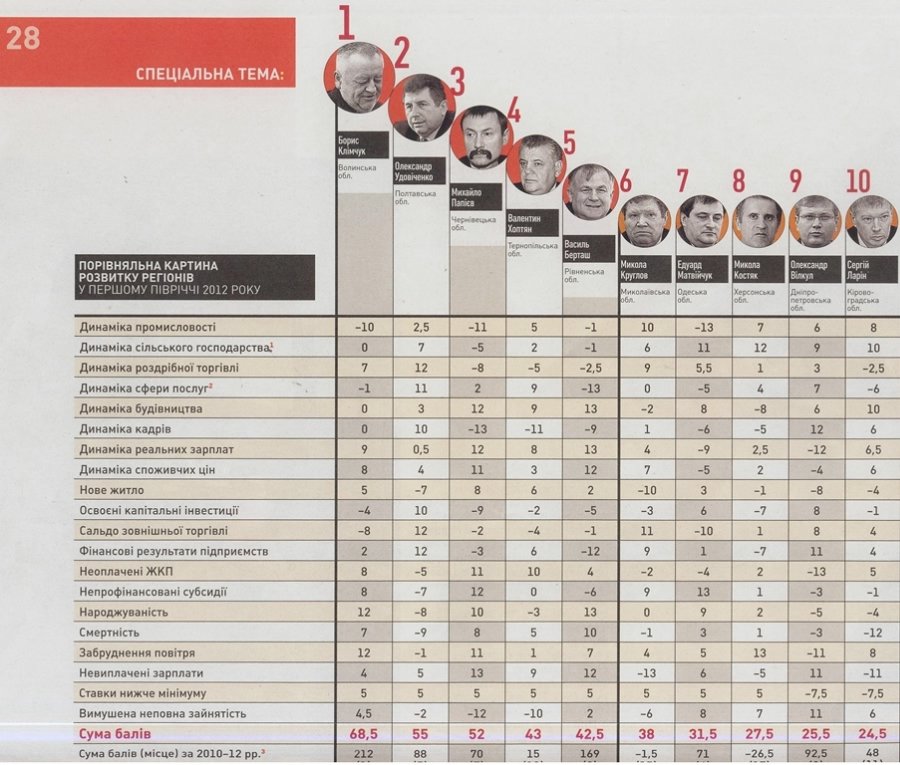 Порівняно з рейтингом за перший квартал («Коментарі» №23(313) від 8 червня 2012 року) трійка лідерів фактично не змінилася. На першій сходинці – волинський губернатор Борис Клімчук. Третю позицію підтвердила Буковина на чолі з Михайлом Папієвим. І лише керівник виконавчої влади сусідньої Рівненщини Василь Берташ поступився другою сходинкою керівникові Полтавщини Олександрові Удовіченку.