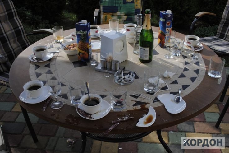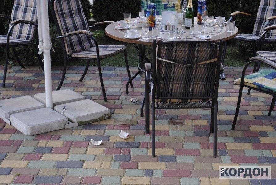 Ось тут і розпочалось справжнє “видовище”: побитий посуд, вирване декоративне дерево, побитий інвентар ресторану та закривавлені серветки тому доказ.