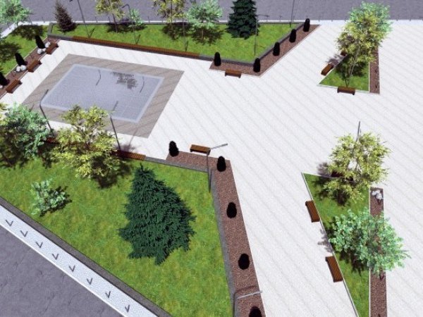 Територія буде викладена бруківкою, на ній передбачено лавочки, ліхтарі, клумби, газони і навіть фонтан.