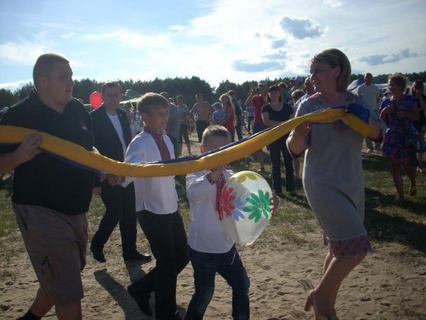 – Я не раз чув, що на березі цього прекрасного озера вже кілька років поспіль відбуваються перегони на байдарках, – сказав парламентар, звертаючись до присутніх. – Оскільки «Батьківщина молода» Волині є співорганізатором цього заходу, запропонував розгорнути тут національний стяг, який виготовила наша молодіжна організація. Він занесений до Книги рекордів України, бо є найбільшим у світі. Його площа – 2400 квадратних метрів!