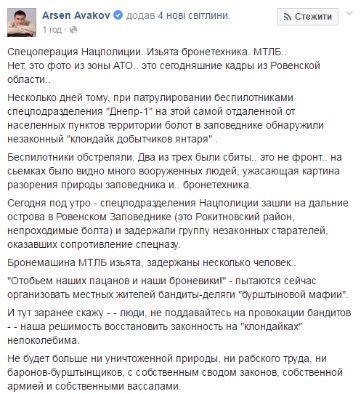 "Кілька днів тому, при патрулюванні безпілотниками спецпідрозділу "Дніпро-1" на цій найбільш віддаленій від населених пунктів території боліт в заповіднику виявили незаконний "клондайк" видобувачів бурштину. Безпілотники обстріляли. Два з трьох були збиті .. це не фронт .. на зйомках було видно багато озброєних людей, жахлива картина розорення природи заповідника і ... бронетехніка.