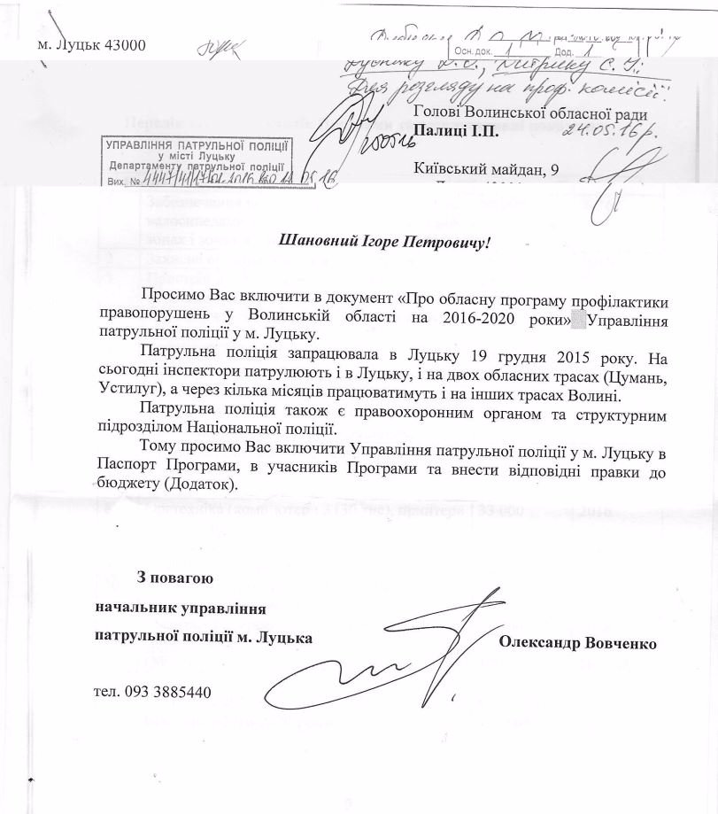 Представник Управління патрульної поліції просить включити правоохоронну структуру в документ "Про обласну програму профілактики правопорушень у Волинській області на 2016-2020 роки".