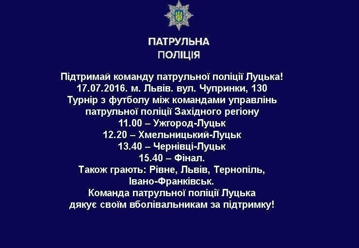 17 липня у м. Львів (вул. Чупринки, 130) відбудеться турнір з футболу між командами управлінь патрульної поліції Західного регіону, - повідомляє патрульна поліція Луцька у Facebook.