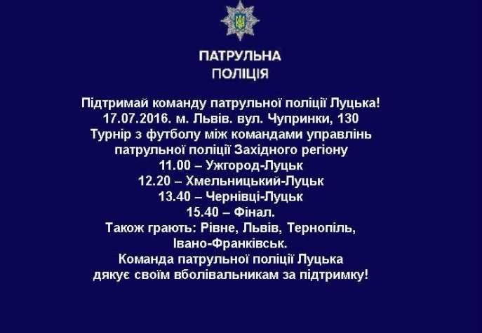 Команда патрульної поліції Луцька візьме участь у турнірі з футболу між командами управлінь патрульної поліції Західного регіону.
