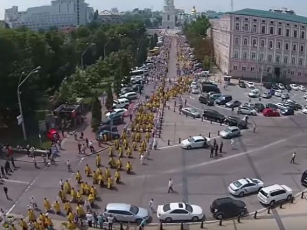 На записі, зробленому квадрокоптером, видно, як учасники ходи направляються до Володимирської гірки, де пізніше пройшов молебень на честь Дня Хрещення Русі.