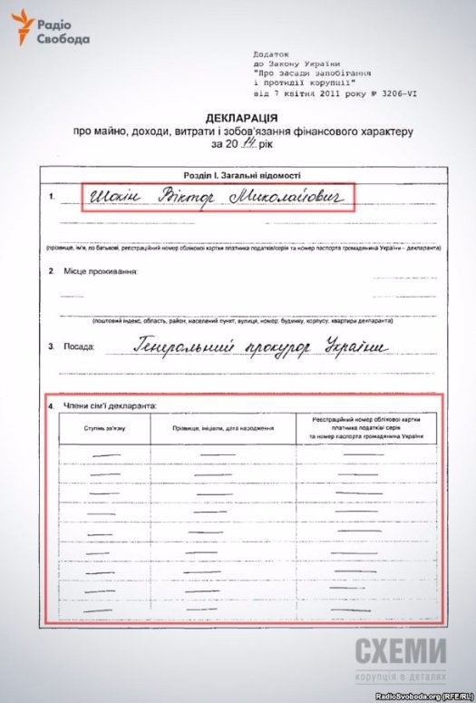 Утім закон говорить наступне: навіть якщо шлюб не зареєстрований, Генпрокурор має вносити у свою декларацію усе майно людей, з якими має спільний побут. Тобто майно його цивільної дружини також мало б декларуватись. У Шокіна ж в графі "Родина" – лише прочерки.