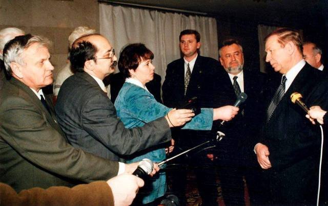 «Імпровізована прес-конференція Президента Леоніда Кучми. Поруч голова ВолинськоїОДА Борис Клімчук. Інтерв'ю беруть Марія Андрушко, Володимир Лис і Василь Федчук»