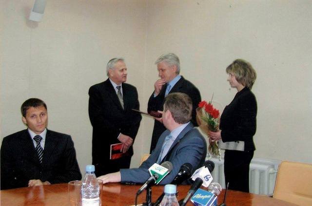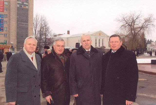 «Із керівниками Волинської ОДА Миколою Романюком і Святославом Кравчуком на дні Лесі Українки в луцьку. Березень 2006 року.»