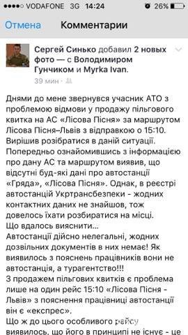"Днями до мене звернувся учасник АТО з проблемою відмови у продажу пільгового квитка на АС «Лісова Пісня» за маршрутом «Лісова Пісня»–Львів з відправкою о 15:10. Вирішив розібратися в даній ситуації.