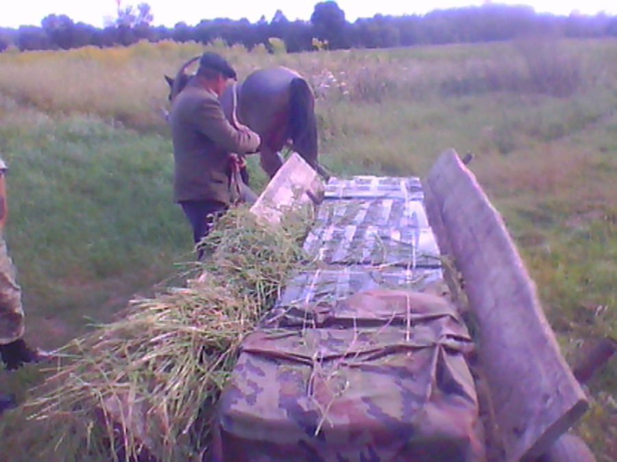 Відпрацьовуючи оперативну інформацію щодо протиправної діяльності на одному з напрямків, близько 18-ї години вечора прикордонний патруль виявив невідомого. Він на гужовій підводі перетнув контрольно-слідову смугу та попрямував у бік державного кордону. Під час перевірки документів 71-річний житель с. Грабове заявив, що їде на свою ділянку сінокосу. Але прикордонники оглянули підводу та виявили під сіном 12 пакунків сигарет. Дідусь зізнався, що перевезти тютюнові вироби він погодився за винагороду, яку йому пообіцяли невідомі.